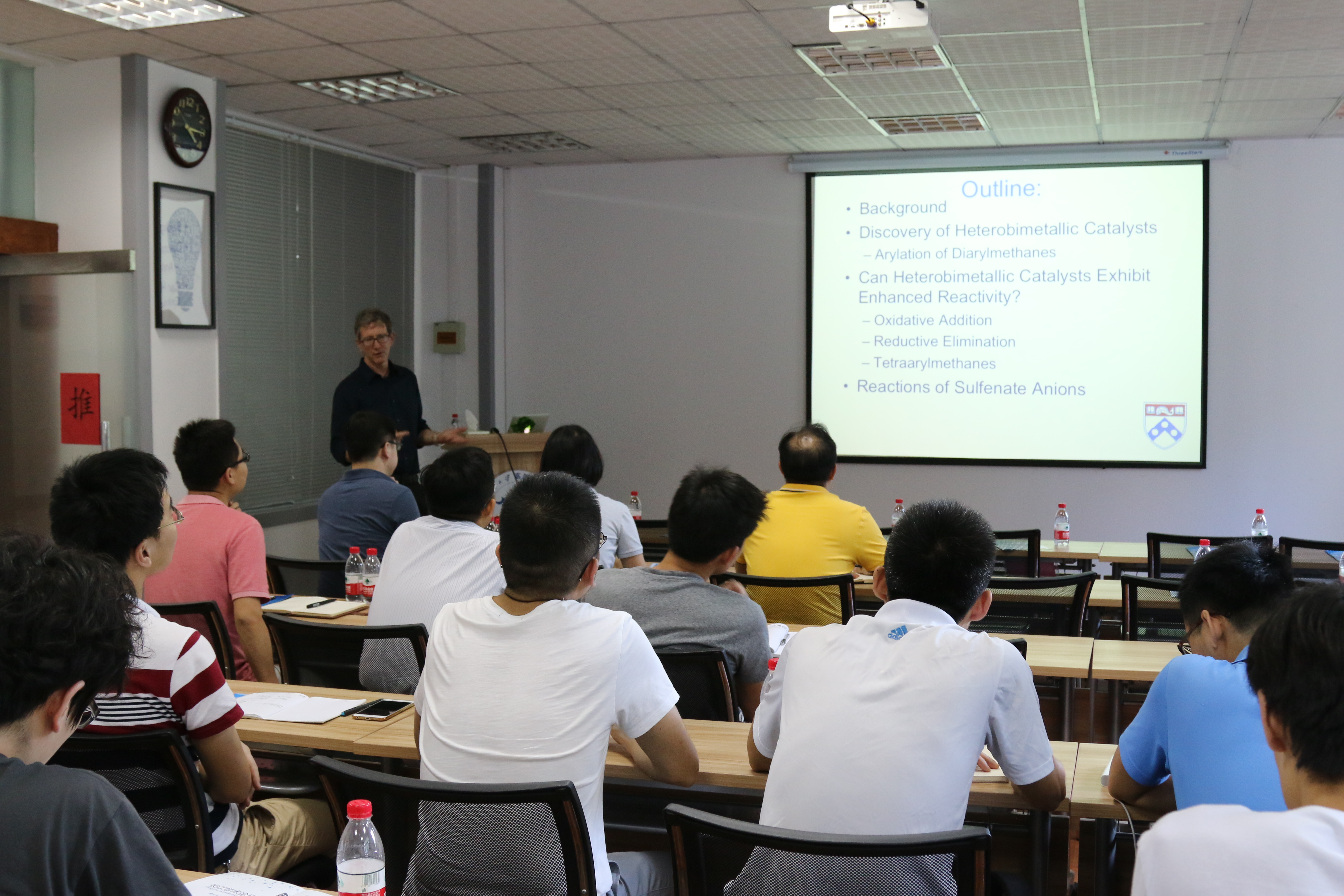 此次报告中,Patrick J. Walsh教授介绍了自己在C-C和C-S键形成反应方面的研究成果,他的实验室开发了一系列Pd和Ni催化去质子交叉偶联过程(DCCP),可以合成用于制药行业的各 种小分子构建模块。Patrick J. Walsh教授还讲述了如何引入一类新的有机催化剂研究,说明次磺酸根阴离子促进苄基卤化物脱氢偶联和形成炔烃,引入苄基氯甲基基团脱氢偶联形成聚合物。最后,Patrick J. Walsh教授与在座的师生又进行了深入的交流,气氛十分热烈。