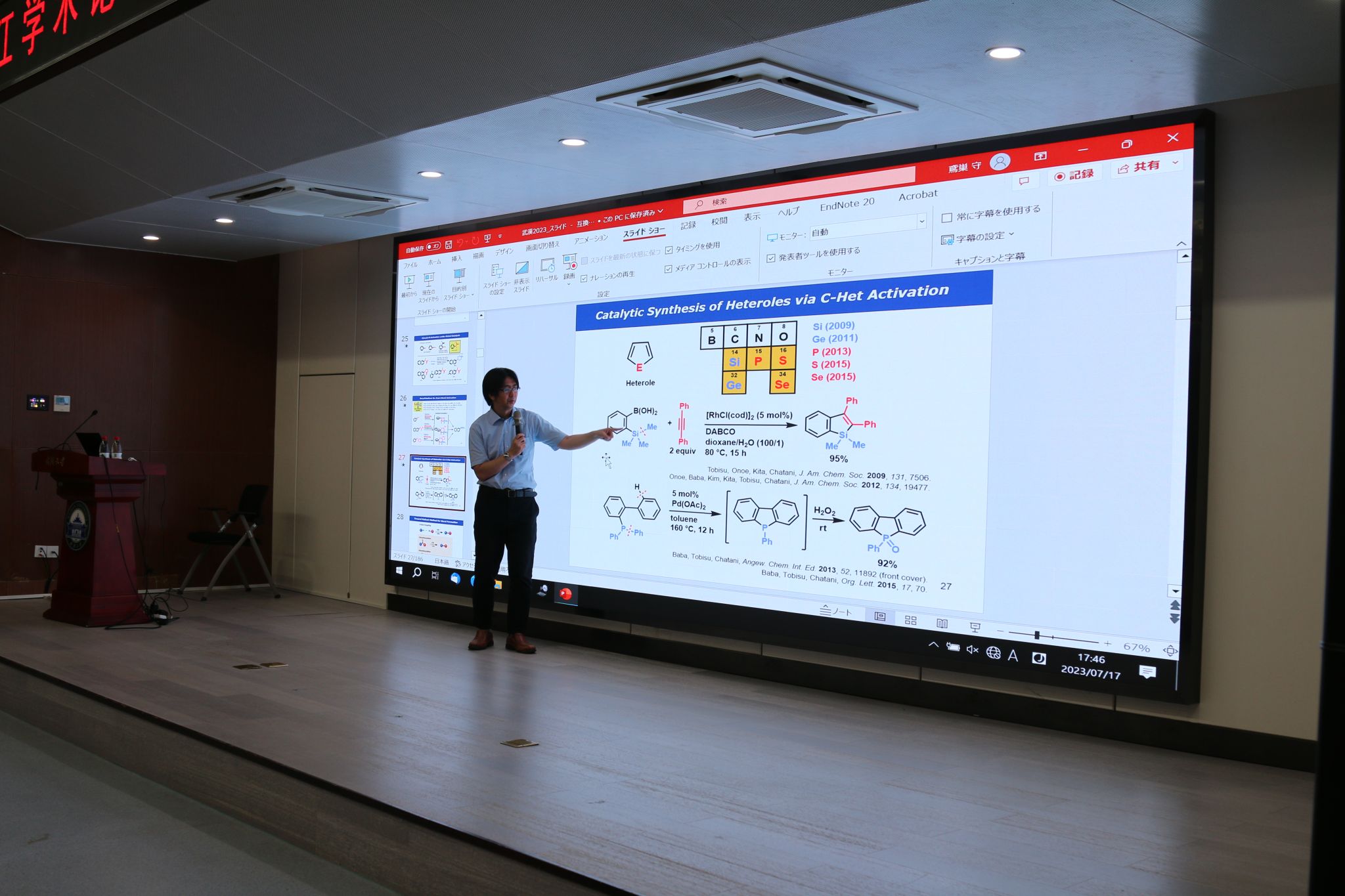 Mamoru Tobisu教授在本次报告中介绍了过渡金属催化剂可以通过裂解C-C、C-N、C-Si和C-F键激活一系列羰基化合物,包括酮类、酰胺类、酰基硅烷和酰基氟化物,并能灵活使用这些反应模式完成一系列催化加成反应,为后续研究者提供新的合成转化思路。