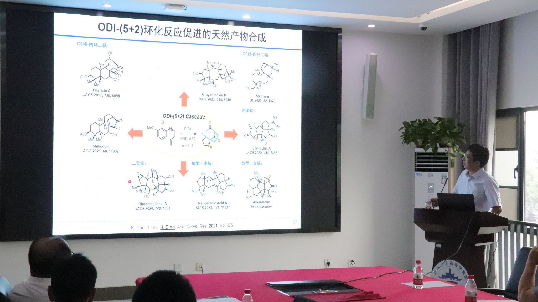 丁寒锋教授重点介绍了其课题组近年来以具有重要活性的萜类、生物碱等天然产物为主要目标,探索和发展了新颖的环化串联反应,实现了一系列复杂分子的高效全合成,为后续功能的研究奠定了基础。针对对映-贝壳杉烷型二萜的特殊骨架结构发展出一类新的[5+2]环加成反应,并以Pharicin A为例探究该方法学在全合成中的应用潜力。报告还介绍了基于氧化去芳香化促进(ODI-)的(5+2)环化反应在四环二萜和多奎烷类天然产物全合成中的重要应用价值。
