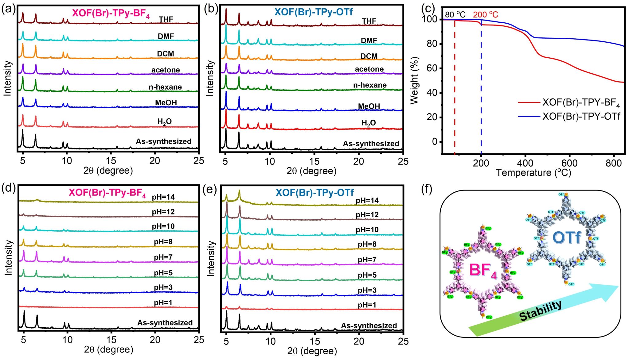 作者进一步研究表明,尽管模型化合物BrPy2BF4/OTf即使在极微量水分存在下也迅速分解,且热稳定性较差,但框架材料XOF(Br)-TPy-BF4/OTf却展现出卓越的化学和热稳定性。它们不仅在多种有机溶剂中保持稳定的二维框架结构,而且在水环境中亦是如此,甚至在广泛的pH范围(3-12)内均能维持稳定。此外,作者还通过实验和理论计算相结合深入研究了抗衡离子对稳定性的影响,用OTf−取代BF4−后,XOF(Br)的稳定性明显提高。