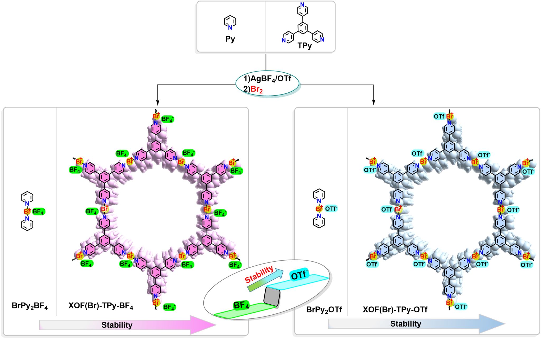 在该工作中,陈世贵课题组首次基于敏感的[N⋯Br⋯N]+卤键构建了稳定的溴(I)桥联二维(2D)卤素键有机框架XOF(Br)-TPy-BF4/OTf,这项工作不仅加深了我们对有机框架的基本认识,而且为多功能XOFs的开发和应用开辟了新的途径。