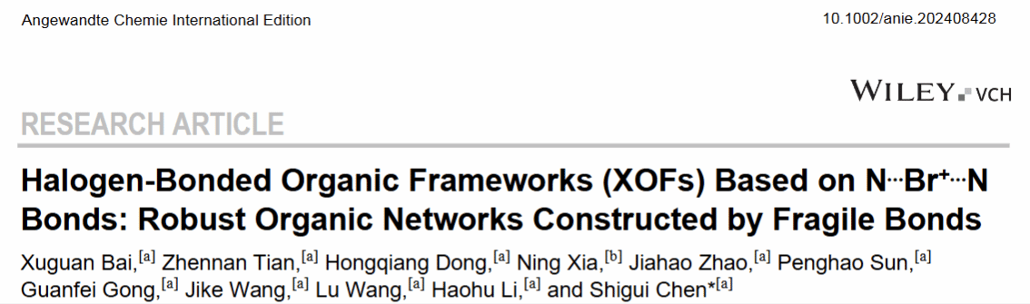 近日,国际权威期刊Angewandte Chemie International Edition (《德国应用化学》)在线发表了17吃瓜 陈世贵课题组在新型卤键有机框架 (XOF)领域取得的最新成果,论文标题为“Halogen-Bonded Organic Frameworks (XOFs) Based on N⋯Br+⋯N Bonds: Robust Organic Networks Constructed by Fragile Bonds”,(DOI: 10.1002/anie.202408428)。