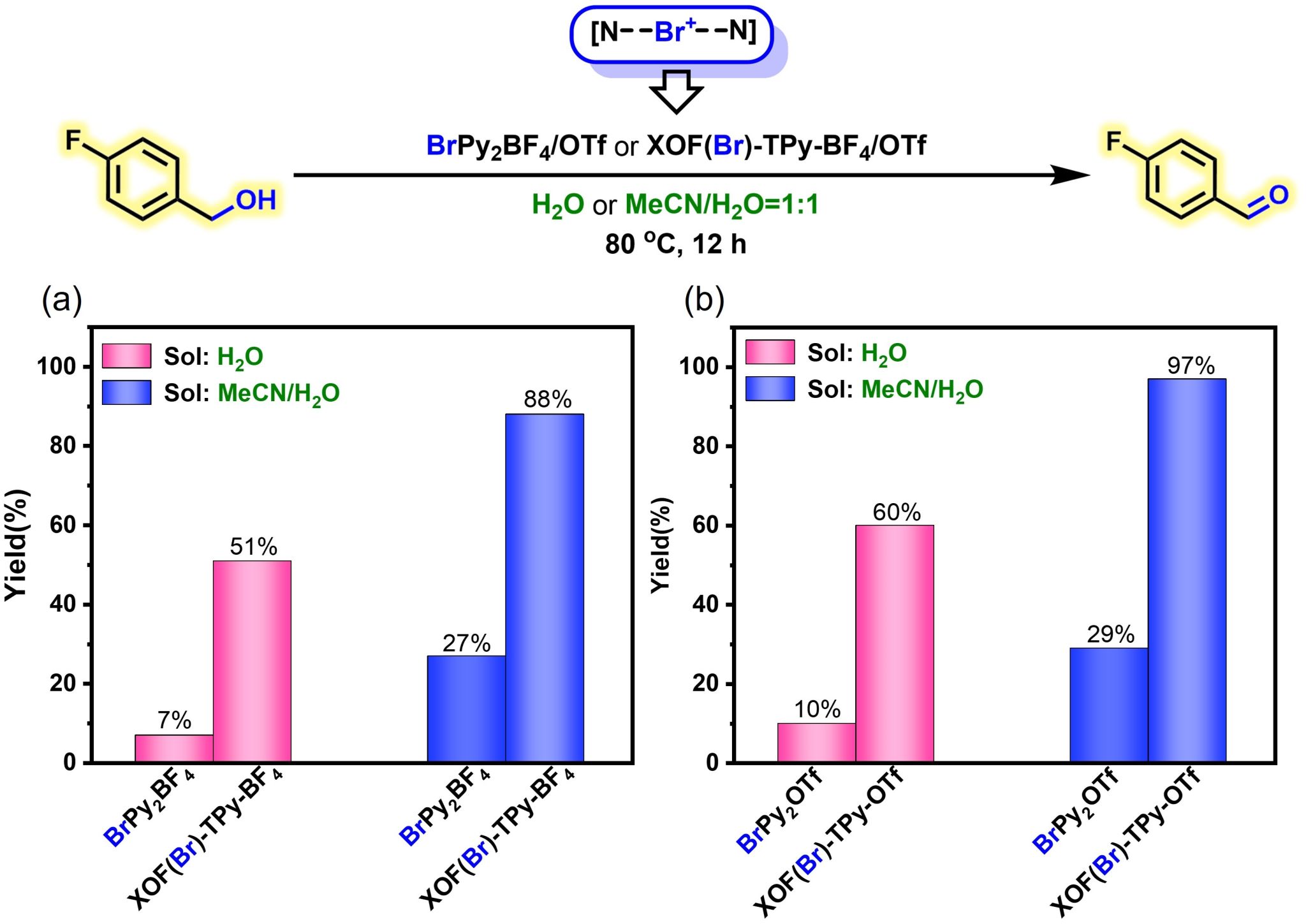 基于此,17吃瓜 陈世贵课题组首次基于敏感的[N⋯Br⋯N]+卤键构建了稳定的溴(I)桥联二维(2D)卤素键有机框架XOF(Br)-TPy-BF4/OTf。这种XOF结构不仅展示了良好的结晶性,并在各种有机溶剂和宽pH范围的水溶液中保持稳定,远超BrPy2BF4/OTf的稳定性。这使得XOF(Br)-TPy-BF4/OTf在水环境中能高效氧化苄醇,扩展了卤键有机框架的应用潜力。