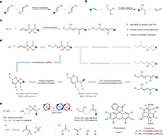 烯烃的官能团互换反应是有机化学中最基本的反应之一,如2005年诺贝尔化学奖获奖的烯烃复分解反应,以及近年来发展迅速的穿梭反应。另一方面,随着自由基化学的进步,烯烃的双官能团化也被广泛应用于精细化工和医药化工领域。基于此,作者设想开发一种新的反应模式,能够在实现烯烃官能团互换的同时,实现双官能团化,且在双官能团化过程中生成新的双键。该反应模式不仅提升了分子的复杂性,同时保留了新的双键,为后续衍生化反应提供了潜力。然而,该模式面临多个难点:其一,烯烃双官能团化过程中,容易出现原子转移自由基聚合或烯丙位官能团化等副反应;其二,远端C(sp3)-H键能较高,反应发生难度大;其三,反应的位点选择性难以精准控制。
