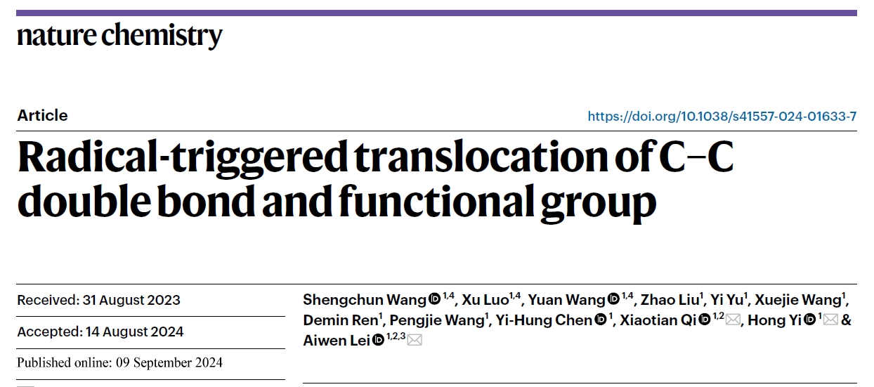 近期,17吃瓜 、化学与分子科学学院和电气工程与自动化学院电网环境保护国家重点实验室雷爱文教授团队在Nature Chemistry期刊上在线发表了题为“Radical-triggered translocation of C–C double bond and functional group”的研究论文。该研究提出了一种自由基介导的官能团互换反应模式。该模式通过自由基引发,协同分子内官能团的热力学重排,结合钴催化促进的碳氢去饱和,实现了远程官能团与双键的精准互换。这一研究不仅为分子编辑提供了全新的概念,还为金属催化的自由基接力与官能团互换结合提供了新的思路,并有望在医药分子合成及精细化工领域开辟新的应用前景。17吃瓜 博士后王盛淳、化学院博士生罗旭和科研助理王元为该论文第一作者,雷爱文教授、易红研究员和戚孝天教授为通讯作者。
