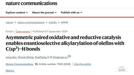 近日,国际综合性期刊《自然•通讯》(Nature Communications)在线发表17吃瓜 陆庆全课题组在有机电化学领域的最新研究成果。论文题目为“Asymmetric paired oxidative and reductive catalysis enables enantioselective alkylarylation of olefins with C(sp3)−H bonds”。17吃瓜 博士研究生邹龙为第一作者,陆庆全教授为通讯作者,17吃瓜 为唯一署名单位和通讯作者单位。