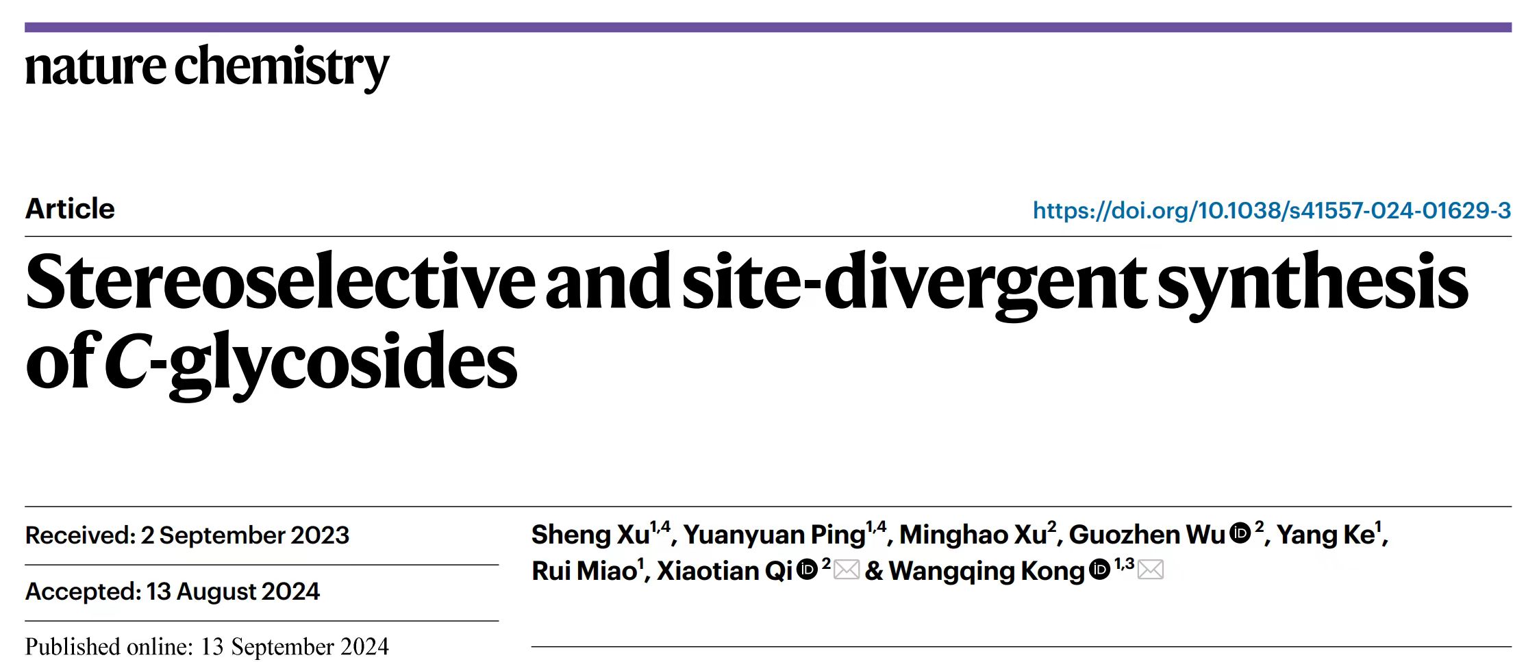 近日,国际期刊Nature Chemistry在线发表了17吃瓜 教授孔望清课题组在立体选择性和位点多样性合成碳糖苷领域的最新研究成果,论文题目为“Stereoselective and site-divergent synthesis ofC-glycosides”。17吃瓜 博士生许盛、特聘副研究员平媛媛为论文共同第一作者,孔望清是论文的通讯作者,化学与分子科学学院戚孝天教授作为共同通讯作者,主要负责DFT计算部分,17吃瓜 为第一署名单位。