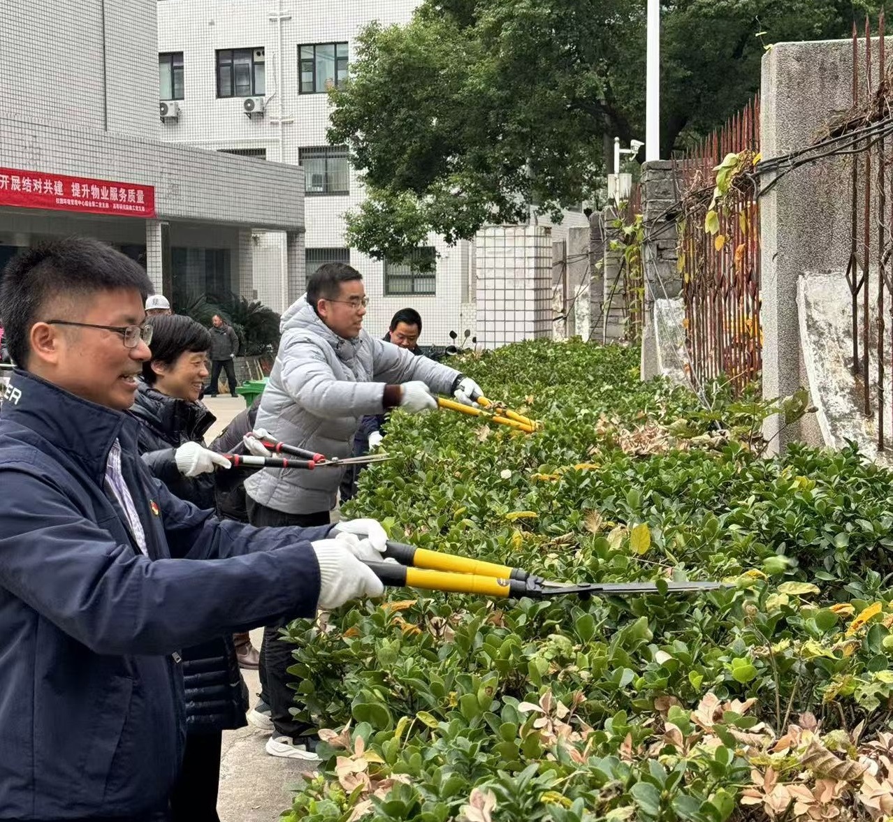 会后,双方党员立即投身到园区环境治理实践中。在绿篱修剪区域,党员们手持修剪工具,科学修剪,精心设计,使园区绿化景观焕然一新,为师生提供了更加美观、舒适的户外活动空间。同时,卫生死角清理小组也深入园区各个角落,对长期积累的垃圾和杂物进行了彻底清理,有效改善了园区环境。