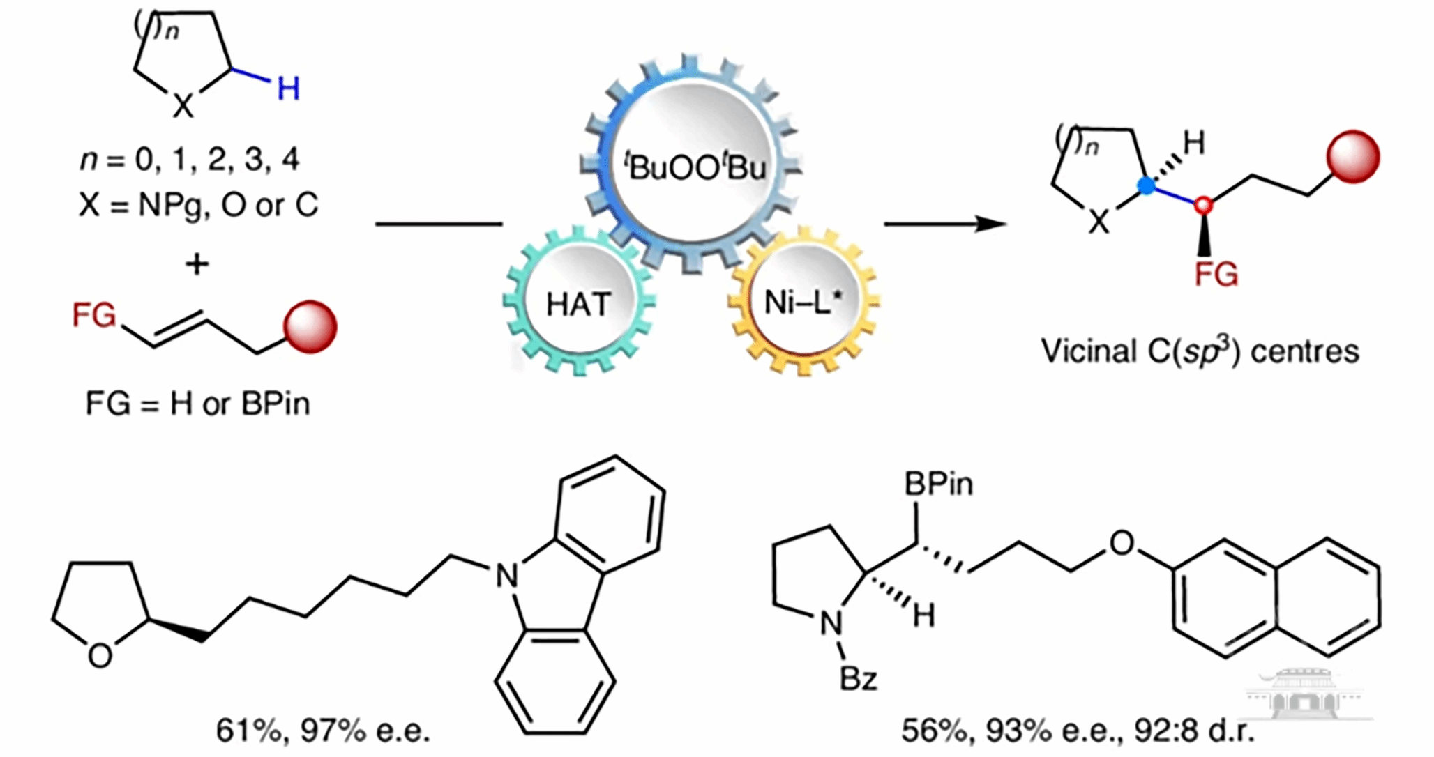 氢原子转移(HAT)策略与过渡金属催化交叉偶联的结合,近年来已成为C(sp3)-H键对映选择性官能化的一种强大工具。在C(sp3)-C键的对映选择性构建中,已经成功地实现了HAT/过渡金属催化的C(sp3)-H氰基化、芳基化、烯基化、炔基化和酰基化等。然而,非导向的氧杂环以及不同环大小的饱和杂环的对映选择性烷基化目前尚未见报道,这限制了其在合成化学中的广泛应用。
