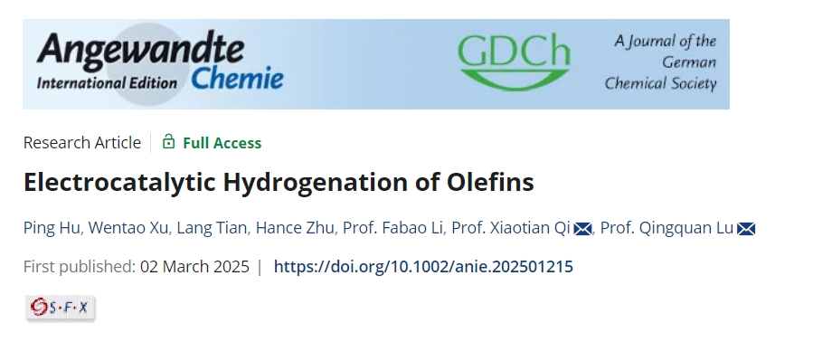 近日,国际权威期刊《德国应用化学》(Angewandte Chemie International Edition)在线发表了17吃瓜 陆庆全课题组和化学与分子科学学院戚孝天课题组在有机电化学合成领域的最新研究成果,论文题目为“Electrocatalytic Hydrogenation of Olefins”。17吃瓜 为该论文的第一署名单位。17吃瓜 博士研究生胡平和许文涛为共同第一作者,陆庆全教授和戚孝天教授为共同通讯作者。