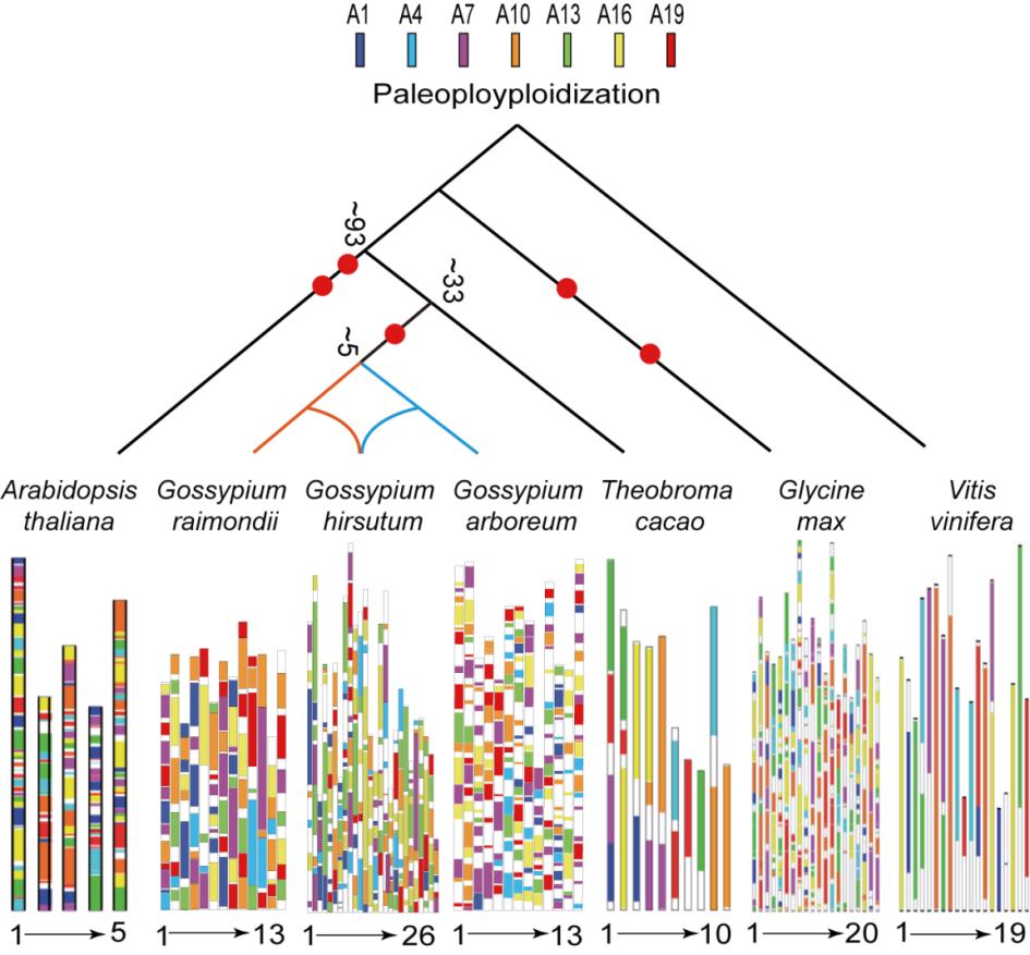 不同的颜色块代表着7个古染色体,一个红点代表一次全基因组复制事件,数字代表分化时间。