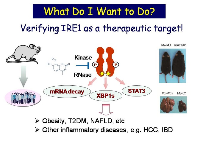 刘勇教授利用动物模型探究了未折叠蛋白响应分子IRE1α在肥胖和代谢疾病中的生理学功能。进一步工作欲鉴定IRE1α的治疗靶标效应并将其运用于新药物开发中。