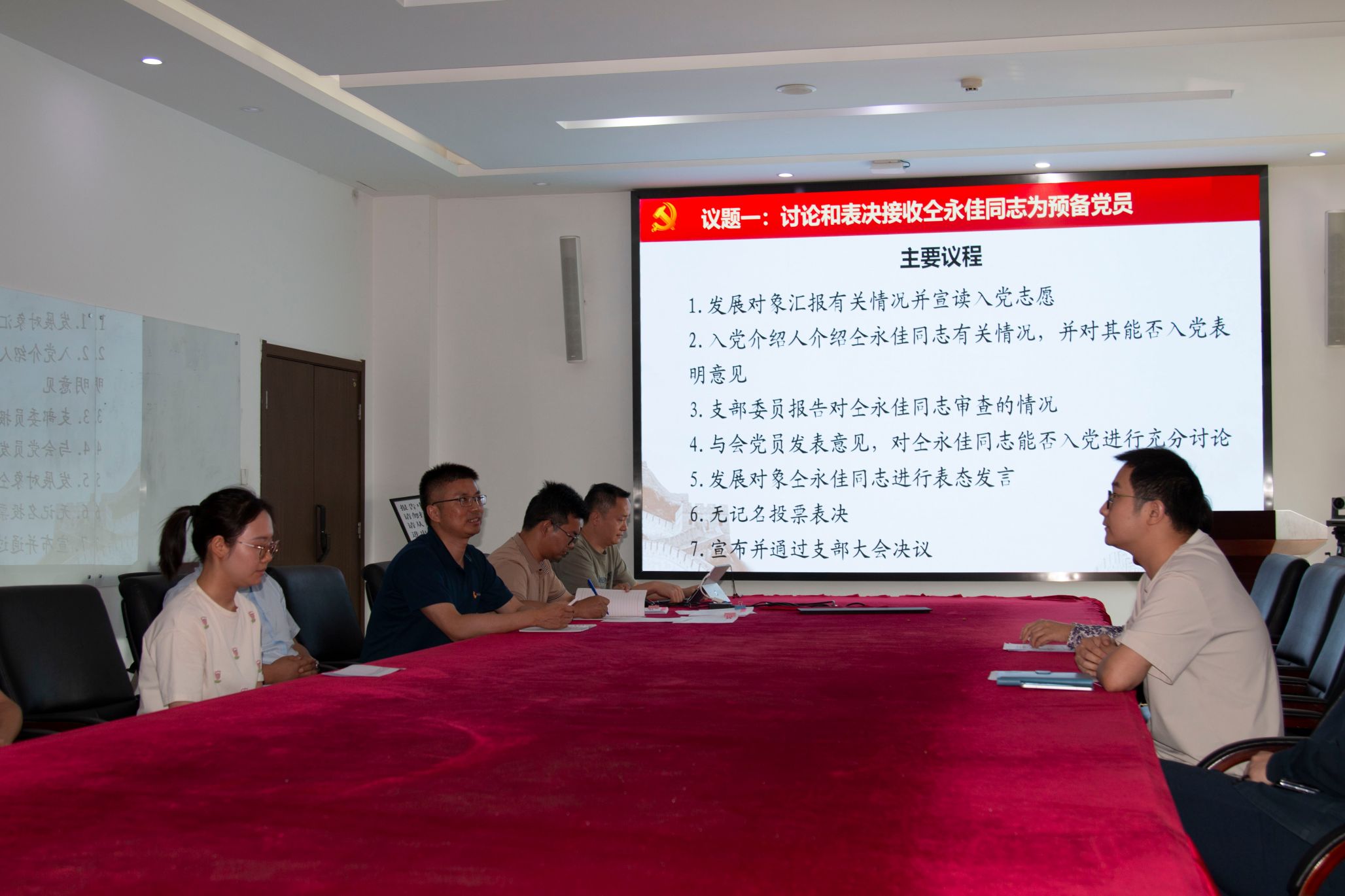 会上,仝永佳介绍了自己的工作经历和积极向党组织靠拢的心路历程,讲述了自己通过学习不断提高自身思想政治素养,增强战略和辩证思维能力,以及在纷繁复杂的环境中牢牢把握正确前进方向的经历。他表示,若能够成为预备党员,将严格以党章和党员标准要求自己,认真遵守党的纪律和各项规章制度,在工作中脚踏实地,用实际行动践行初心,证明自己对党的忠诚与担当。入党介绍人胥国勇、张鹛媚汇报了仝永佳同志的培养情况和综合表现,组织委员谢章斌汇报了党员和群众意见及支委会对仝永佳的审查情况。与会正式党员经过无记名投票,一致同意接收仝永佳为预备党员。