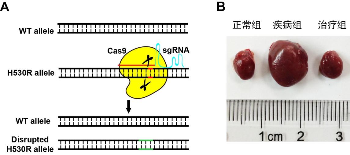 研究人员从患病的家系中检测到AMPK2的H530R突变,并构建了表达该突变基因的转基因小鼠和基因敲入小鼠模型。两种小鼠模型均成功再现了病人的主要病理特征,从而首次证实该突变导致PRKAG2心脏综合征的发生。研究人员将基因编辑工具CRISPR/Cas9装载在安全高效的AAV9中并递送到小鼠心脏表达,实现特异性地编辑突变的等位基因,并显著逆转该心脏病的主要指标,首次证实CRISPR/Cas9基因治疗策略可用于治疗人类的显性遗传心脏病。