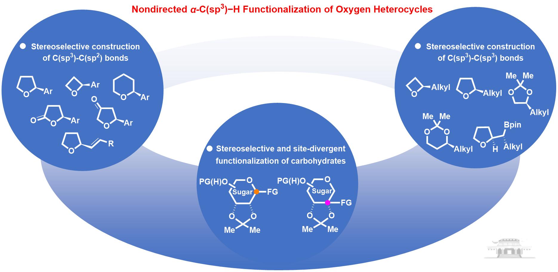 针对这一挑战性课题,孔望清研究团队系统性地开展了通过氢原子转移(HAT)与金属协同催化来实现非导向含氧杂环立体选择性官能化的研究,并取得系列重要突破。首先,该团队以易得的氧杂环化合物为原料,成功实现了不对称C(sp3)−H芳基化和烯基化反应,高效构建了多种高附加值手性氧杂环骨架。该研究深入探究了环效应、配体类型及光催化剂等因素对C(sp3)−C(sp2)键形成的调控机制,阐明了各催化组分的协同作用原理。随后,该团队创新性地开发了氧化氢原子转移与还原偶联协同催化体系,率先实现了饱和杂环化合物的不对称C(sp3)−H烷基化反应,为立体选择性构建C(sp3)−C(sp3)键提供了全新的解决方案。此外,团队还开发了以1-脱氧糖苷作为糖基给体合成多种类型C-糖苷类化合物的通用合成方法。该团队还发展了通过配体的位阻来精准调控碳水化合物位点选择性官能化,为异头碳糖苷和含芳基季碳立体中心的特殊碳水化合物的发散性合成开辟了新途径。这些创新性方法的合成价值已通过多种天然产物、重要药物分子及关键合成砌块的高效构建得到充分验证,为含氧杂环化合物的精准合成提供了重要的方法论指导。