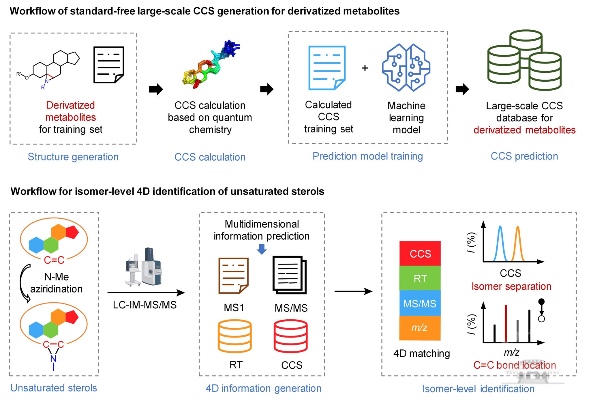 量子化学计算辅助的衍生代谢物CCS预测及其用于异构体水平甾醇组学分析示意图