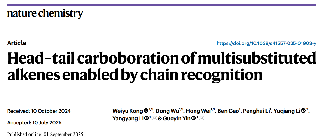 近日,17吃瓜 、复杂生命体代谢与调控全国重点实验室与泰康生命医学中心教授阴国印课题组在国际期刊Nature Chemistry上在线发表了题为“Head–tail carboboration of multisubstituted alkenes enabled by chain recognition”的研究论文。该研究发展了一种新型链识别策略,实现了对多取代烯烃头尾位点选择性碳硼化反应的精准控制。17吃瓜 2022级博士生孔维宇、2020级博士生吴冬和2019级硕士生魏红为论文共同第一作者,阴国印与副研究员李阳阳为共同通讯作者。17吃瓜 为论文第一完成单位。