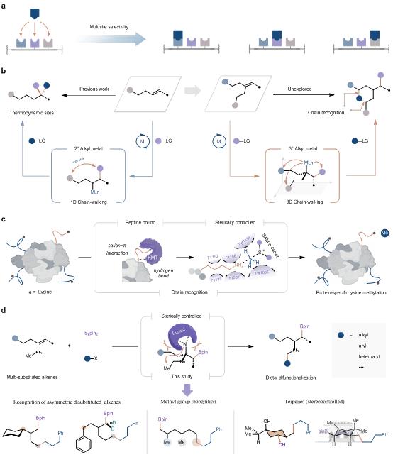 多取代烯烃位点选择的挑战、生物链识别的启发,以及本研究提出的空间受控链识别模型