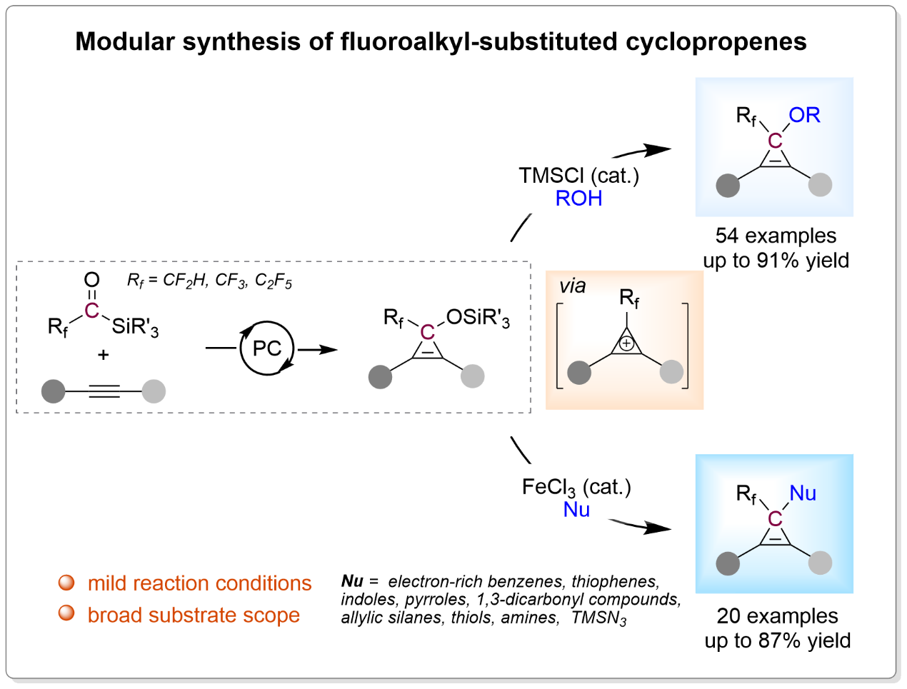 在该工作中,沈晓团队报道了氟烷基酰基硅烷作为卡拜阳离子等价体的应用,实现了氟烷基取代环丙烯的模块化合成,通过一个反应构建了三个新的共价键。该反应的成功关键在于将连续光催化和酸催化整合于一个反应体系中——光催化促进卡宾与炔烃的[2+1]环加成反应,而酸催化通过环丙烯中间体实现C-O键官能团化。利用该策略,作者成功合成了结构多样的氟烷基化环丙烯基醚、芳烃、烷烃、硫醚、胺类及叠氮化物。这些反应不仅能高效制备简单的环丙烯衍生物,而且为传统方法难以合成的复杂环丙烯化合物提供了新的制备途径。