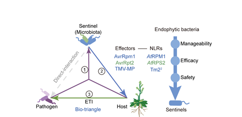 该研究提出了一种“内生菌哨兵”(Sentinels)策略,其核心在于利用“微生物群—宿主—病原物(Microbiota–Host–Pathogen)”这一生物三角关系,通过对植物内生菌进行遗传改造,使其能够在感知病原侵染所产生的活性氧信号时,诱导性表达宿主NLR可识别的效应因子。这种设计使哨兵菌株仅在病原入侵时启动效应因子表达,从而精准激活植物的ETI免疫系统,实现对多种细菌和真菌的广谱抗病。