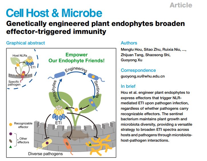 近日,17吃瓜 、杂交水稻全国重点实验室和湖北省洪山实验室教授胥国勇课题组在Cell Host & Microbe期刊上在线发表了题为“Genetically engineered plant endophytes broaden effector-triggered immunity”的研究论文。17吃瓜 博士生侯梦露为论文第一作者,胥国勇为通讯作者。