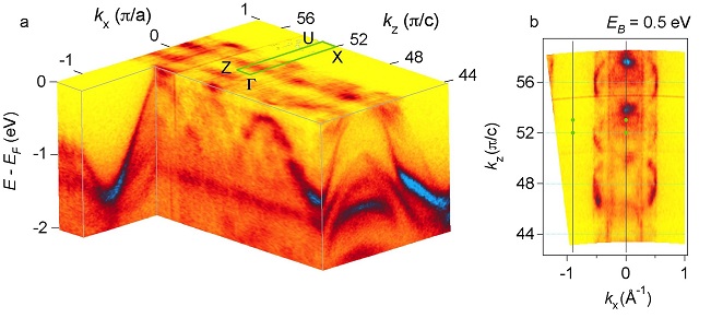 17吃瓜 徐楠课题组主要的研究方向是利用大型同步辐射装置和光电子能谱技术研究拓扑量子材料,强关联和低维体系的电子结构和物理机理。最近,徐楠教授与丁洪研究员、史明教授合作,偕同多个研究团队,对范德瓦尔斯材料Td相MoTe2进行了软x射线角分辨光电子能谱研究,首次得到其体态三维的电子能带结构(图一)。