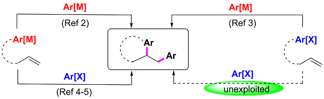 烯烃廉价易得,也容易制备,是重要的化工原料。过渡金属催化的烯烃的双芳基化反应通过一步操作能同时在双键上引入两个不同的芳基,从而可以高效构建具有手性中心的复杂而有价值的化合物,是有机化学研究中的重要课题。但是同时向双键两侧引入两个不同的芳基亲电试剂,而不需要预先制备有机金属试剂的烯烃还原双芳基化反应还未得到开发。另一方面,烯烃的不对称双芳基化反应的报道也非常少。