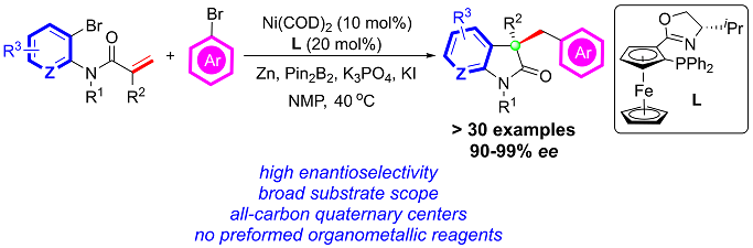 论文题为《镍催化活性烯烃的不对称还原双芳基化》(Ni-Catalyzed Enantioselective Reductive Diarylation of Activated Alkenes by Domino Cyclization/Cross-Coupling,DOI: 1021/jacs.8b08190)。论文由博士研究生王快(第一作者),硕士研究生丁正天、周志俊共同完成,孔望清为通讯作者。
