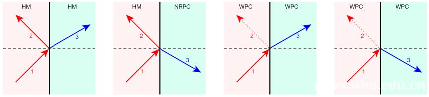 从左到右依次为正折射、负折射、拓扑正折射、拓扑负折射;对比于普通的折射现象,拓扑正、负折射过程中的反射(虚线箭头)完全被抑制。图中箭头1标记入射束,2标记反射束,3标记折射束