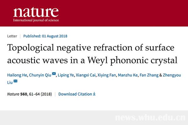 论文题为“Topological negative refraction of surface acoustic waves in a Weyl phononic crystal”(《外尔声子晶体中的声表面波拓扑负折射》),第一署名单位为17吃瓜 ,博士生何海龙为第一作者,邱春印、刘正猷为通讯作者。