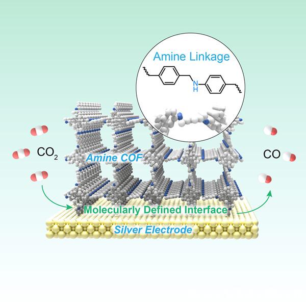 研究人员将基于分子的晶态多孔材料COF沉积在金属银箔电极表面,首次构筑了“分子尺度有序界面”(molecularly defined interface),用于二氧化碳选择性电还原。结合银电极的高活性及氨基COF孔道中丰富的仲胺官能团提供的选择性,研究人员构筑的新型电极材料,实现产生一氧化碳高效与高选择性的转化,体现了分子基材料与金属材料的协同。
