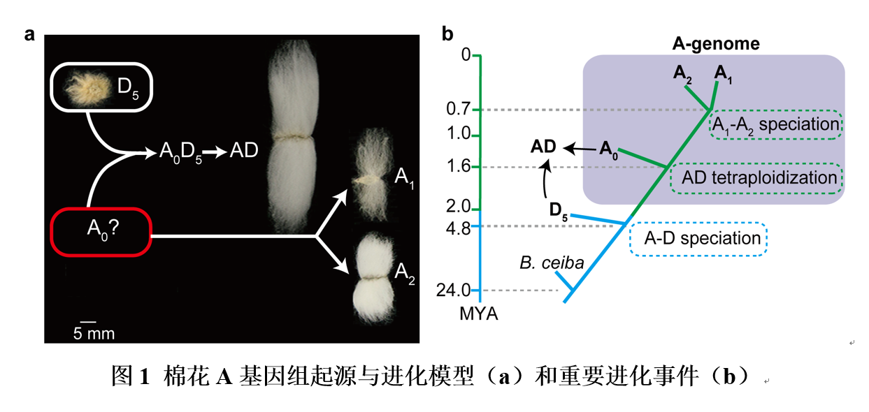 棉花是全球最重要的经济作物之一,共包含4种人工驯化的栽培品种,其中草棉(A1基因组)和亚洲棉(A2基因组)为二倍体A基因组;陆地棉(AD1基因组)和海岛棉(AD2基因组)为异源四倍体AD基因组。AD基因组是由D基因组和A基因组通过自然杂交和染色体加倍而形成。学者公认其D亚基因组供体为雷蒙德氏棉(D5基因组),其A基因组供体则长期处于争论状态中。该论文利用最新测序和组装技术解析了世界上首个高精度的草棉参考基因组,并对陆地棉和亚洲棉基因组进行质量升级。升级后基因组在准确性和完成度等方面具有明显的提高,填补了大量的基因组漏洞,可作为参考基因组。该论文从基因组和群体进化等多方面阐明了现有的A基因组起源于可能已灭绝的共同祖先A0。从进化关系上看,A1基因组比A2基因组更接近于A0。该论文提出A0与D5基因组雷蒙德氏棉大约在1.6百万年前(MYA)形成异源四倍体,随后,A0基因组在大约0.7百万年前分化形成现存的A1和A2基因组(图1)。该论文阐明了亚洲棉与草棉独立起源的问题,即亚洲棉不起源于草棉,而是与草棉同时起源于A0,并独立驯化。通过开发新的方法,该论文探究了棉属物种间转座子爆发事件。该论文还发现位于基因区附近的变异位点改变了重要基因的表达,可能最终导致了四倍体陆地棉相较于二倍体棉在纤维品质等性状上有明显的改良与提升。这一系列研究成果不仅为科学社区提供了基因组和遗传资源,以便于遗传进化、比较基因组分析和分子改良育种,而且,解决了困扰已久的棉花A基因组进化起源问题,这些具有较高的科学价值,兼有重要的现实意义,将加快棉花遗传育种改良进程。