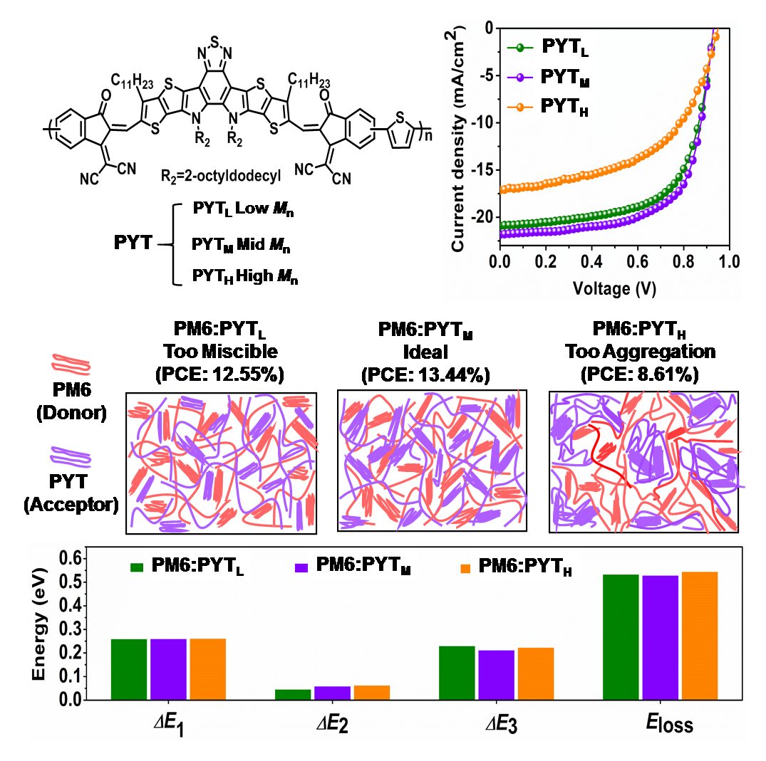 图1. PM6:PYT光伏体系及其器件效率、混合膜形貌示意图和器件能量损失。