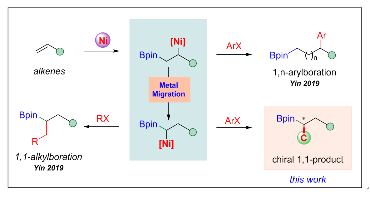 由于有机硼化合物具有较好的官能团转化性,具有一定潜在应用价值。17吃瓜 阴国印课题组致力于利用过渡金属迁移策略实现一系列的烯烃碳硼化反应,如烯烃的1,n-芳基硼化反应(Angew. Chem. Int. Ed. 2019, 58, 4612-4616),烯烃的1,2-芳基硼化反应(Org. Lett. 2019, 21, 396 -3971),烯烃的1,1-烷基硼化反应(Angew. Chem. Int. Ed., 2019, 58, 8872-8876),烯烃的1,1-炔硼化反应(ACS Catal. 2020, 10, 4888−4894)等。