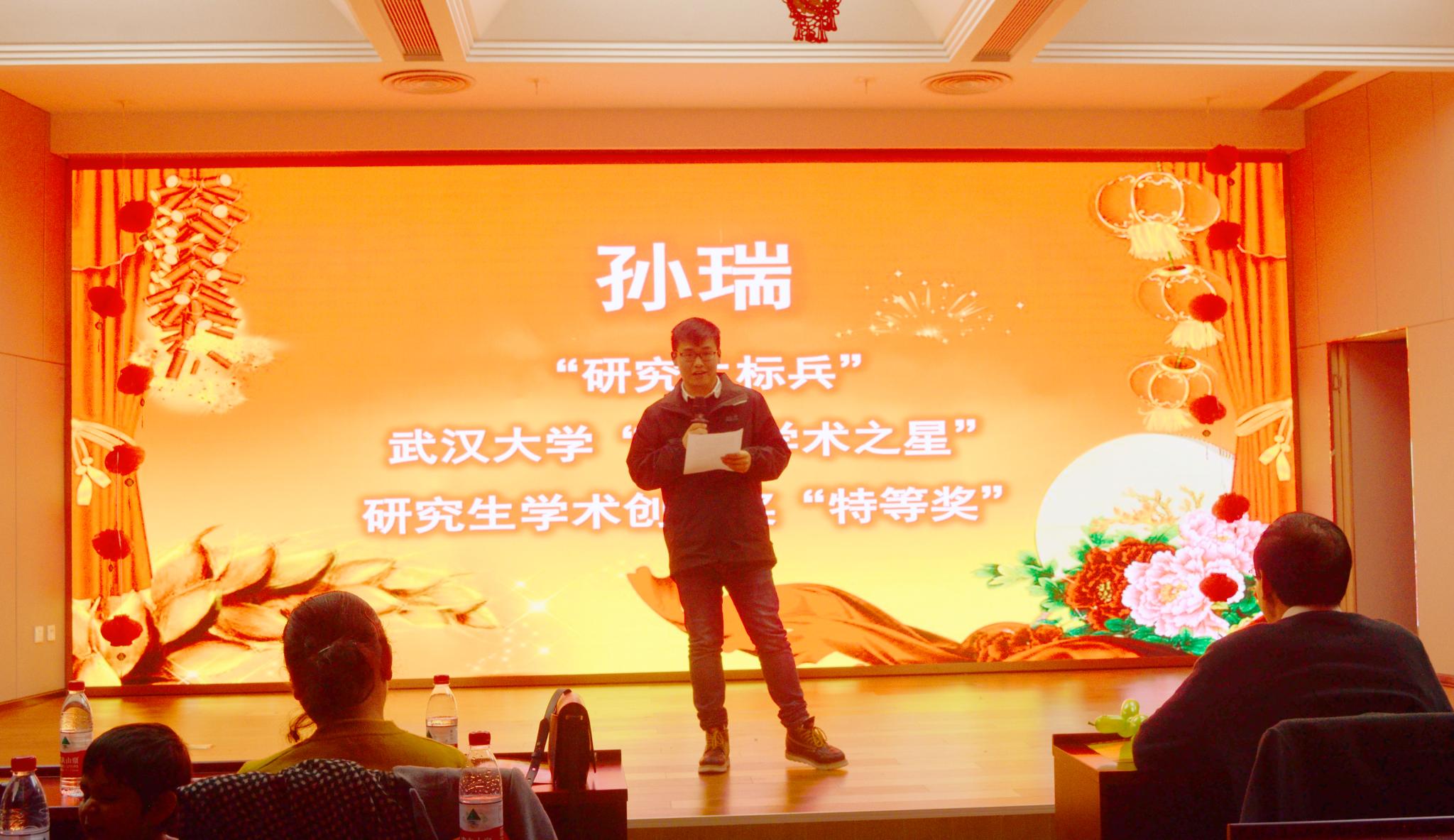 2019年17吃瓜 “十大学术之星”(获奖者中唯一一名硕士)、“研究生标兵”、学术创新奖特等奖获得者、2017级硕士研究生孙瑞代表研究生发言。他首先表示由衷的感谢,坦言取得目前的成绩,得益于导师闵杰老师的学术指导和人格魅力影响、课题组同学的帮助以及高研院这一学术平台的支持。并分享了在硕士阶段科研的心得:不断的努力,不要轻易放弃。最后祝福老师们工作顺利!同学们新的一年科研顺利,成果多多!