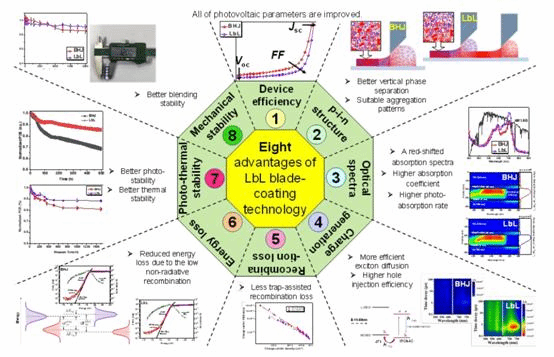 在这项工作中,课题组通过在线PL详细描述了BHJ和LbL共混物在成膜过程中的分子动力学内在特征,将不同的3D形态特征与BHJ和LbL共混物的光电流产生和提取过程以及它们在器件中的稳定性问题相关联并系统地评估了它们的多个目标参数,包括形态特征,光学模拟,物理动力学,器件效率和混合稳定性问题。结果表明,相比于传统的BHJ方法,该课题中的LbL方法具有明显的优势,如图2所示。具体如下所述:1. LbL刀片刮涂有助于受体分子与供体混合,从而获得具有合适D / A的热力学上更有利的纳米形态界面区域。通过独立地控制和优化D和A沉积,可以容易地获得这种期望的分层形态。2.与BHJ混合物相比,LbL混合物的3D几何形貌可实现更高的光吸收系数,从而改善电荷在活动层中生成。3.供体和受体之间合适的形态和界面可以有效地提供强电荷转移驱动力和同时电荷转移的小能量损失。同时,这种类似p-i-n的结构也有利于在适当的电极处的电荷传输和收集,从而可以进一步减少非成对的复合。4.具有合适的垂直相分离的LbL共混物表现出比BHJ共混物更稳定的形态。LbL方法更有利于降低有机太阳能电池的效率-稳定性差距,甚至是商业应用中BHJ方法的优越替代方案。