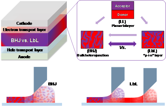 图1 真空蒸发平面双层结构、溶液处理体异质结(BHJ)结构和逐层结构(LbL或伪双层)。