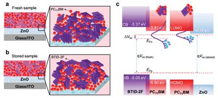 图1显示了BTID-2F:PC­71BM活性层在ZnO界面处其薄膜形态特征随时间变化的示意图;同时也描绘了在这种界面形貌变化条件下相关物理机制的演变。说明了BTID-2F:PC­71BM BHJ/ZnO界面处的能量紊乱随着时间的推移而逐渐消除,提升了负极区域的费米能级,从而降低了能量损失,导致了器件Voc的改善。
