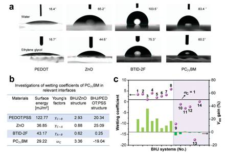 图2提供了小分子给体材料BTID-2F,受体材料PC­71BM,电子传输层ZnO以及空穴传输层PEDOT:PSS的表面能以及相关的润湿系数(图2b)。此外图2c提供了14中富勒烯和非富勒烯体系与ZnO界面的浸润系数;通过图可知,器件电压的增益是与材料体系间的润湿系数密切相关的。因此,这类系统研究说明了材料界面能的不同是导致是否存在Voc自发增益的直接原因。