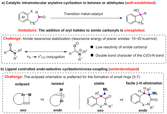 过渡金属催化芳基卤化物与醛、酮、酯的分子内加成已被广泛研究用于构建苯并稠合杂环化合物,而对于反应活性更低的酰胺与芳基卤化物的加成报道较少。酰胺键氮原子与羰基之间强烈的p-π共轭作用呈平面结构,因此酰胺键具有双键性质,较难断裂(图1a)。近些年来,通过化学方法选择性的切断酰胺氮-碳键取得了重要的进展。主要是通过酰胺的亲电预活化以形成高度亲电的亚氨中间体,从而能够与有机金属试剂化学选择性地合成酮,或者直接使用扭曲的酰胺与有机金属试剂亲核加成。这些方法使用预制备的高活性有机金属试剂,造成反应条件苛刻,官能团兼容性差等缺点,因此探索在温和条件下高效切断氮-碳键的方法,对合成化学的发展具有重要的意义。另一方面,在小环合成中,钯催化的分子内Heck环化仅以exo环化的形式进行,因为endo环化在空间上不利,且endo环化中间体由于空间位阻较大,难以进行进一步的交叉偶联反应,易于发生β-H消除等副反应。目前配体控制的选择性7-endo/交叉偶联反应尚未见报道(图1b)。