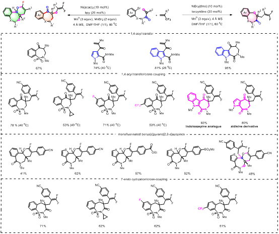该课题组在还原条件下,实现了酰胺碳-氮键活化的1,4-酰基迁移/交叉偶联反应;还通过配体调控实现了7-endo环化/偶联模式,可以区域发散性的合成各种含有偕二氟烯丙基片段的2-苯并氮杂卓衍生物。通过配体调控的发散合成可以将同一起始原料转化为不同的分子骨架,不仅能够快速构建结构丰富的小分子化合物库以供生物活性筛选,同时还能揭示催化转化的新模式。