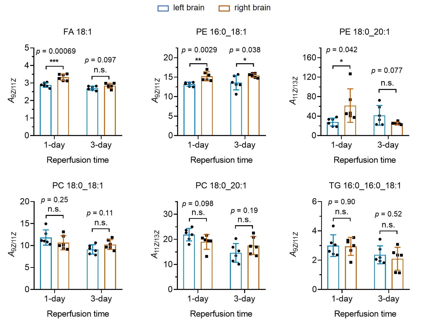 此外,他们还利用开发的不饱和脂质异构体分析方法,对小鼠脑缺血及其再灌注恢复过程中的脂质异构体比例进行了定量分析(图3)。首次发现脑缺血会导致脂肪酸(FA)和磷脂酰乙醇胺(PE)双键在9位和11位以及双键在11位和13位的异构体比例发生显著性变化,而再灌注恢复过程会使其得到显著改善。说明C=C位置异构体的生物合成受到了脑缺血的显著影响,再灌注过程可使其得到改善,可能与这些过程中不饱和脂类的代谢重编程有关。