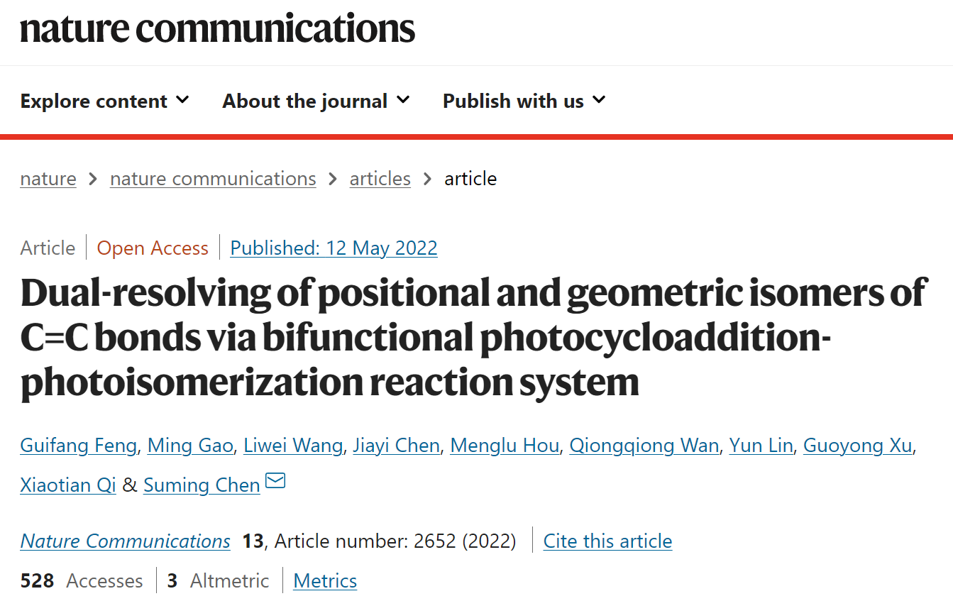 近日,Nature Communications(《自然•通讯》)在线发表了我院陈素明教授课题组在化学、生物学和医学学科交叉研究的最新成果,论文题为“Dual-Resolving of Lipid Positional and Geometric Isomers of C=C Bonds via Bifunctional Photocycloaddition-Photoisomerization Reaction System”。该研究利用开发的双功能化学反应和色谱-质谱联用技术,解决了在生命科学研究中长期存在的不饱和脂质双键顺反异构大规模分析鉴定的难题,进而实现了脂质双键异构的全维度分析,为研究脂质异构体的生物功能提供了重要的分析方法。