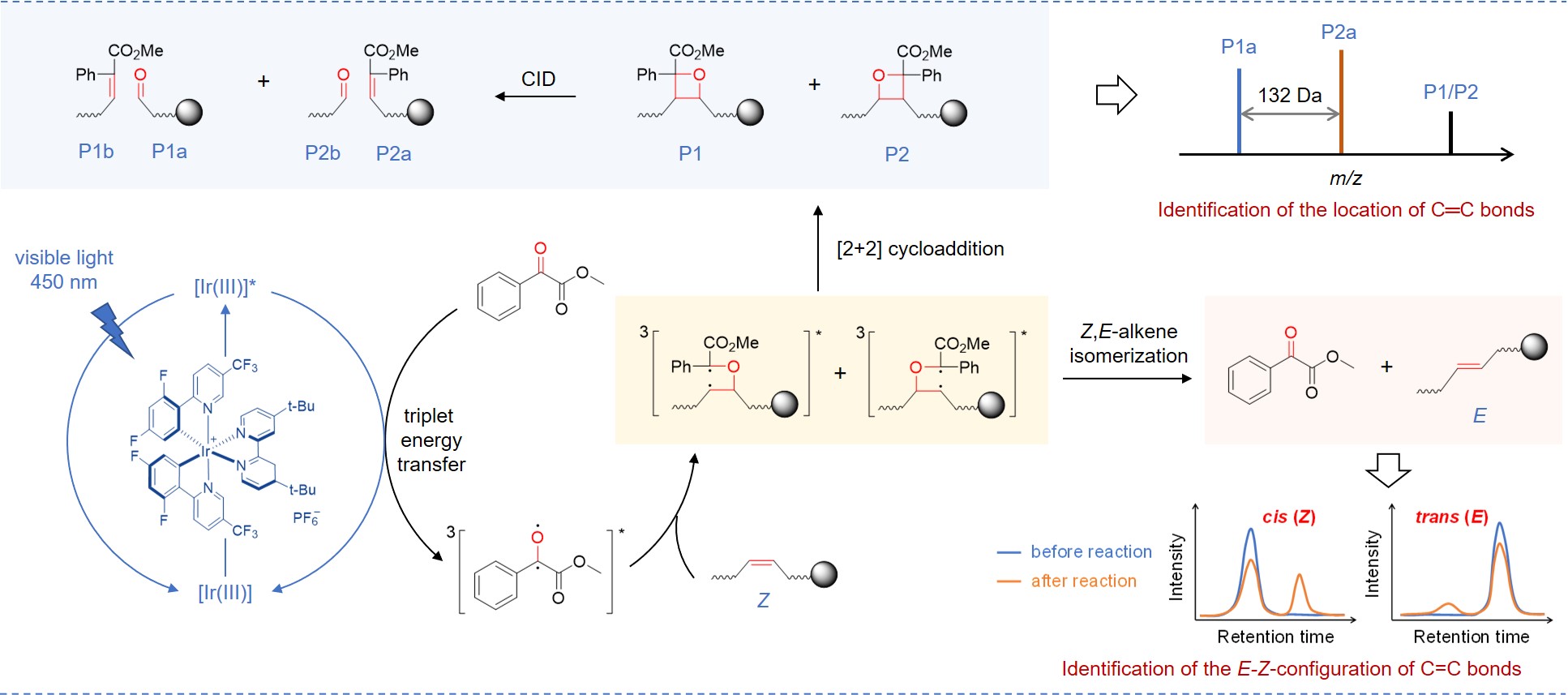 图1.利用可见光催化双功能反应体系实现脂质双键异构体分析示意图
