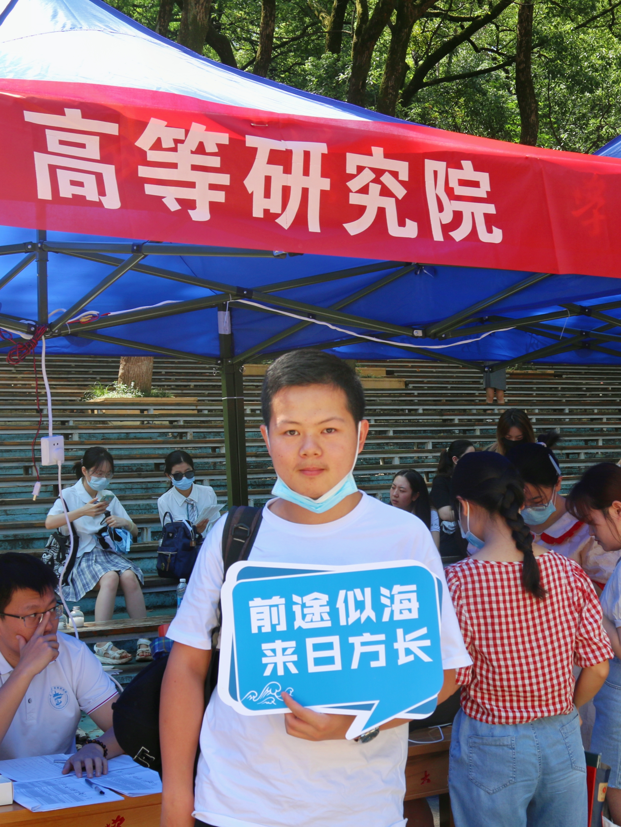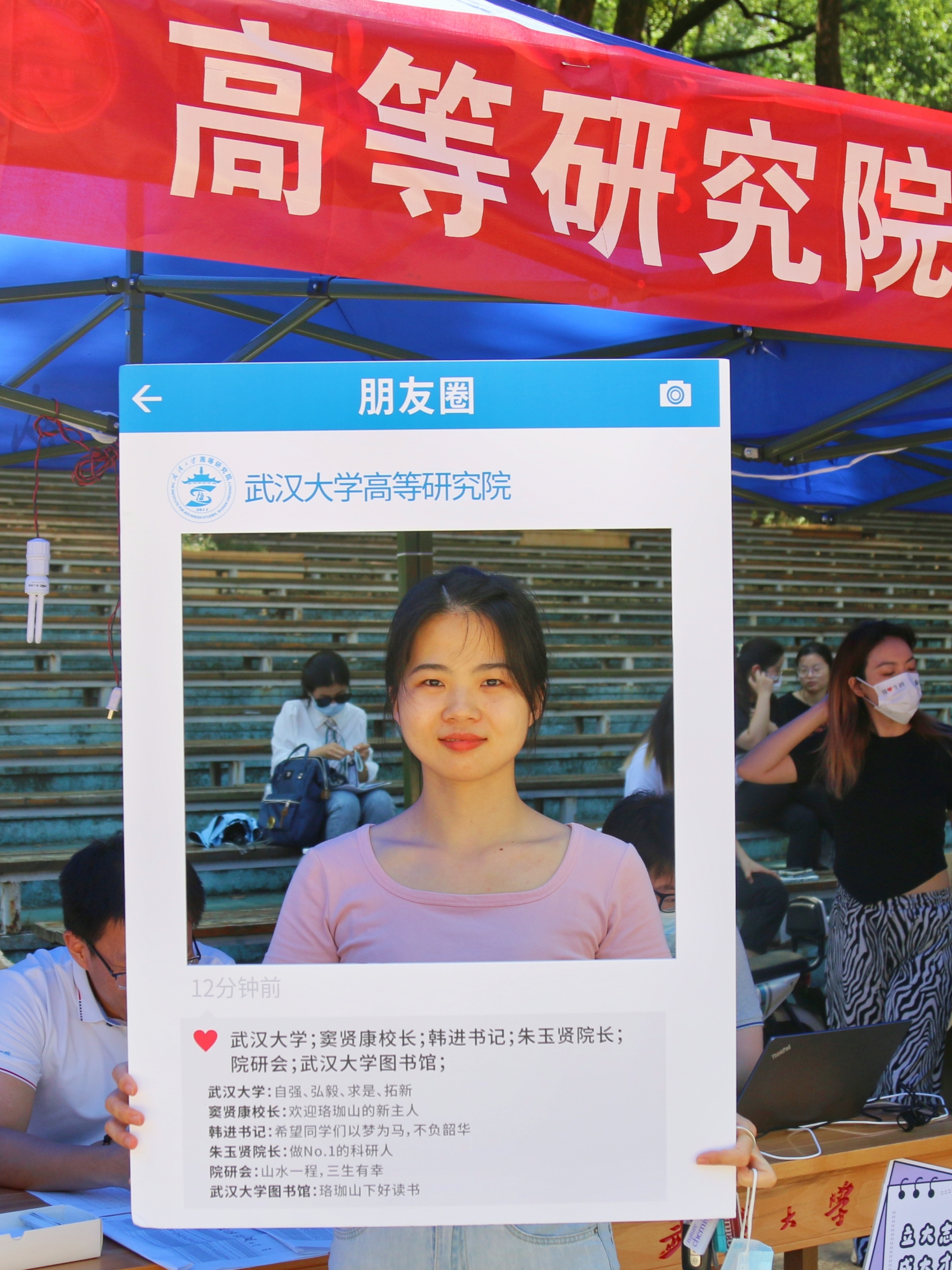 新生们纷纷手持写有“缘起珞珈,高研同行”、“滴!科研生活已到账!”等字样的KT板拍照留念。恰同学少年,风华正茂,灿烂的笑容,自信的面庞,映照高研新生的从容自信、神采飞扬,展示着他们对未来的向往和期待。