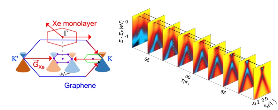 石墨烯-氙单原子中高阶摩尔效应对电子结构调制示意图(左图)和不同摩尔周期中狄拉克复制能带的移动(右图)