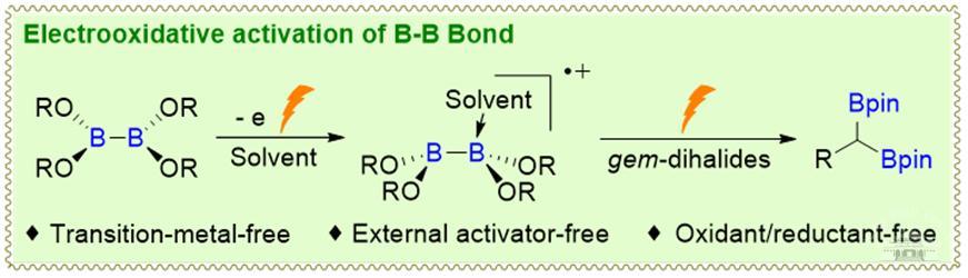 图1.电氧化活化硼-硼键新模式及其应用于烷基偕二硼化合物的构建