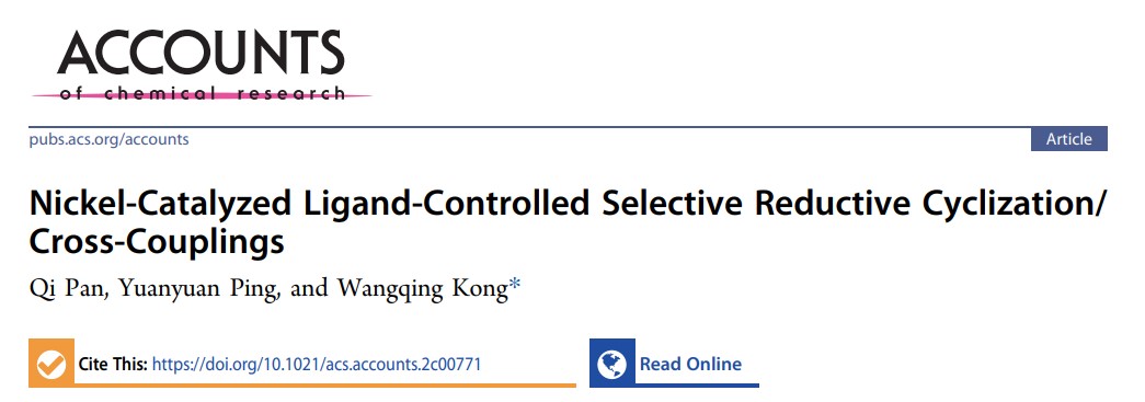 近日,我院孔望清教授受美国化学会Accounts of Chemical Research杂志邀请撰写专题综述,总结了该课题组在镍催化配体调控的选择性还原环化/交叉偶联方面的特色研究成果。该论文从实现环化对映选择性和环化模式的控制两方面进行了全方面的归纳总结,并对该领域的未来发展方向给出了具有前瞻性的展望。相关研究成果以题为“Nickel-Catalyzed Ligand-Controlled Selective Reductive Cyclization/Cross-Couplings”在美国化学会旗下顶级学术期刊Accounts of Chemical Research上发表,并被选为正封面论文。17吃瓜 博士研究生潘琪为该论文第一作者,孔望清教授为通讯作者,17吃瓜 为论文的唯一署名单位。
