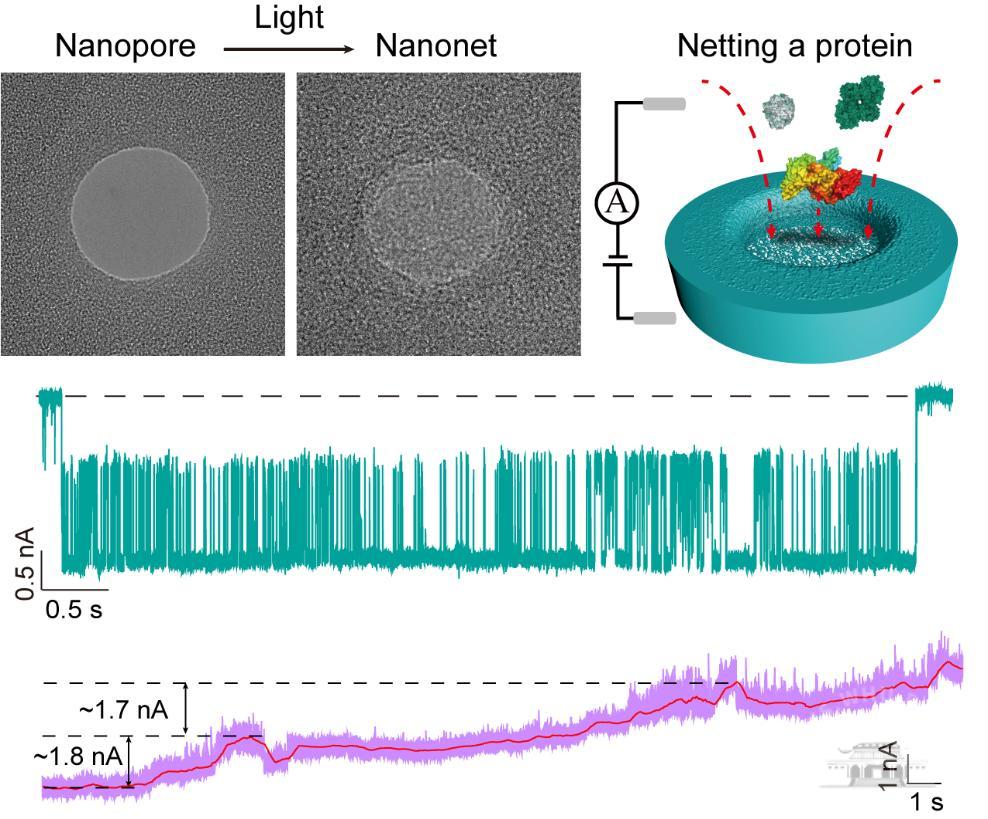 蛋白质作为生命活动的主要承担者,在生物体内发挥着重要的功能,包括催化代谢、信号传递、物质运输和免疫等。利用固态纳米孔在单颗粒水平上实时获取溶液中蛋白质的结构信息是基础研究前沿热点。但蛋白过孔速度太快,需要对纳米孔进行修饰特定的配体分子锚定蛋白,或者寻求高带宽测试仪器。因此纳米孔束缚的方式受到了广泛关注。不过,蛋白质的颗粒尺寸较小,在溶液中布朗运动明显,捕获单个蛋白质非常困难。基于此,翟月明课题组开发了一种可靠且简便光驱动制造技术,将氮化硅纳米孔转化为稳定的纳米网平台,并通过电泳或电渗流对单个蛋白质进行捕获,实现了其结构和功能的研究。