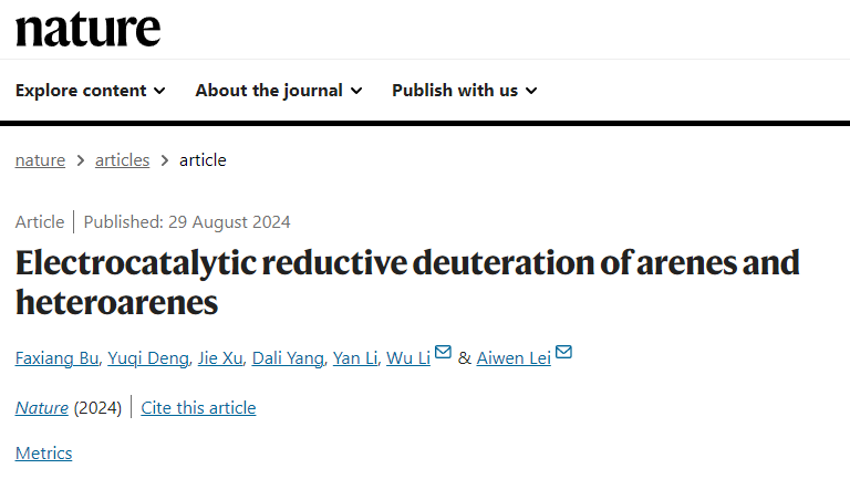 8月29日,Nature在线发表了17吃瓜 化学与分子科学学院、17吃瓜 雷爱文/李武教授团队的最新的电合成新技术研究,题为“Electrocatalytic Reductive Deuteration of Arenes and Heteroarenes”(电催化芳烃和杂芳烃还原氘代)。17吃瓜 化学与分子科学学院博士步发祥、17吃瓜 博士生邓宇琪为论文的共同第一作者,李武教授、雷爱文教授为通讯作者,17吃瓜 为唯一署名单位。